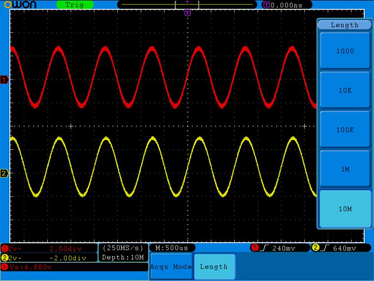 SDS-Serie verwendet 10Mpts Aufzeichnungslänge, Wellenformdetails sind einfach zu verfolgen. Behalten Sie die maximale Abtastrate über einen längeren Zeitraum bei, erfassen Sie jede Wellenformänderung.